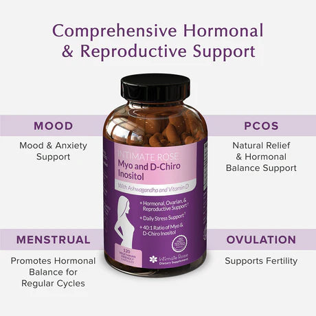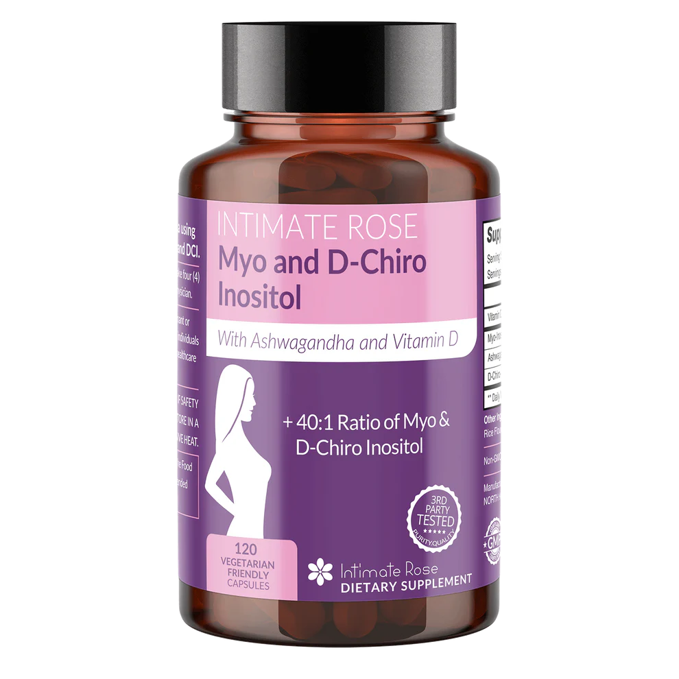 • El inositol es un compuesto similar a las vitaminas del complejo B que actúa como un mensajero secundario en diversas rutas hormonales. Existen dos formas principales: Myo Inositol (MI) y D Chiro Inositol (DCI). El suplemento de Intimate Rose utiliza un 40:1 de MI:DCI combinado con ashwagandha y vitamina D, especialmente diseñado para el bienestar reproductivo y hormonal femenino. Este equilibrio se inspira en la proporción fisiológica que el cuerpo convierte de MI a DCI y está pensado para favorecer la fertilidad, la regularidad menstrual y el estado de ánimo
