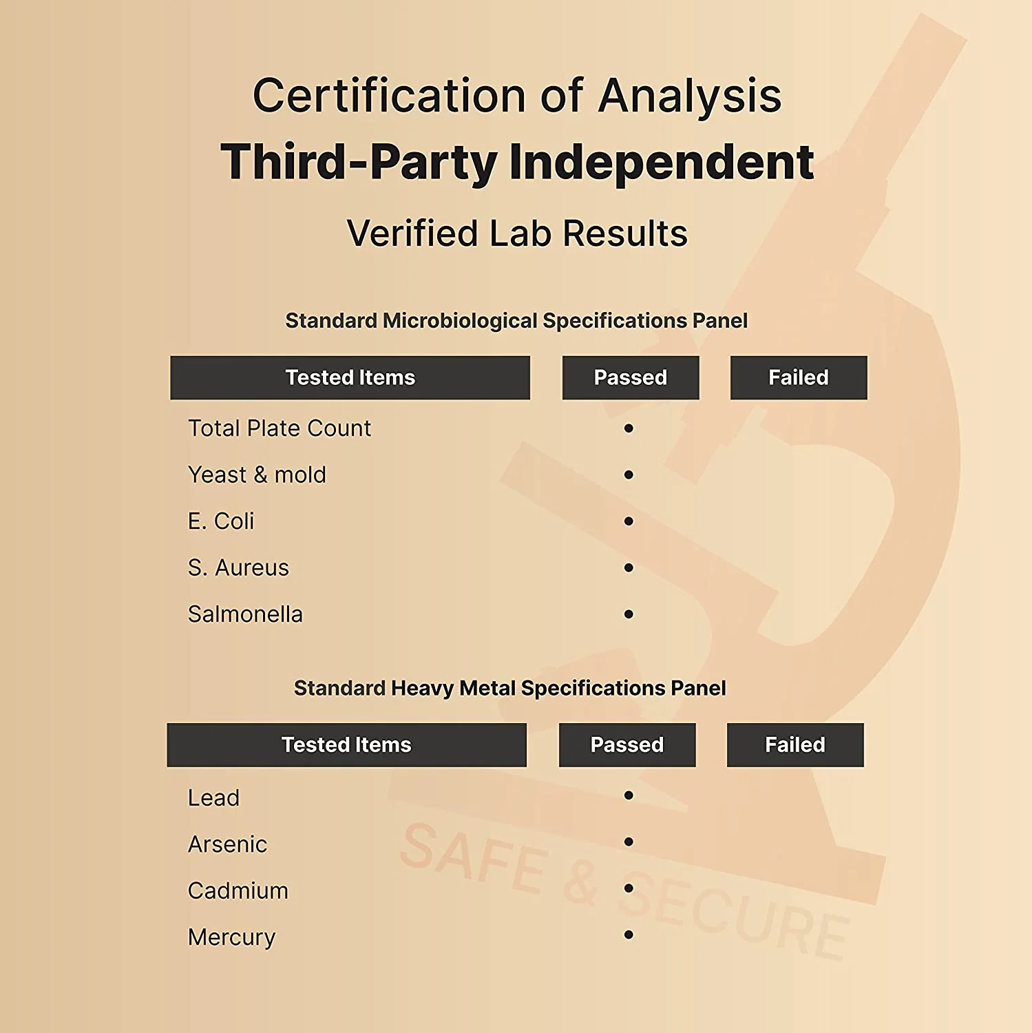 • Ingredientes de alta calidad: cápsulas vegetales no transgénicas, sin trigo, soja, lácteos, gluten ni frutos secos; doble sellado y probadas por laboratorio de terceros